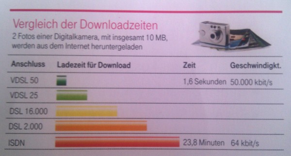 Neulich hatte ich einen Flyer der Telekom im Briefkasten, der mir das schnelle VDSL schmackhaft machen sollte. Und zwar mit diesem tollen Geschwindkeitsvergleich: